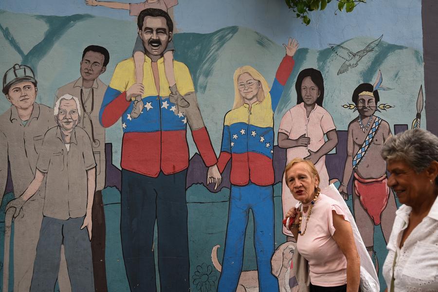 Pessoas caminham em frente a um mural em Caracas, Venezuela, em 5 de novembro de 2025. (Foto por Marcos Salgado/Xinhua)