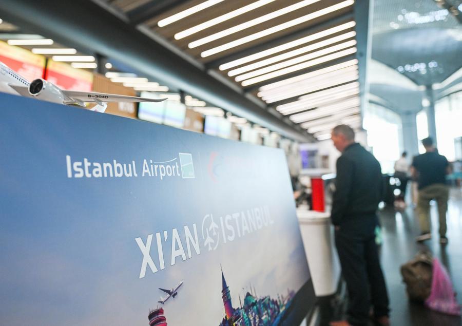 Passageiros fazem check-in nos balcões da China Eastern Airlines para embarcar no primeiro voo direto da companhia aérea de Istambul para Xi'an, no Aeroporto de Istambul, na Turquia, em 24 de junho de 2025. (Xinhua/Liu Lei)