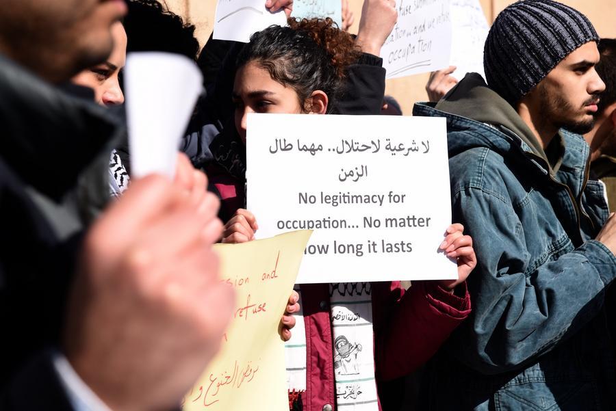 Pessoas participam de protesto contra as declarações do primeiro-ministro israelense, Benjamin Netanyahu, sobre a desmilitarização do sul da Síria, em frente ao escritório das Nações Unidas em Damasco, Síria, em 25 de fevereiro de 2025. (Foto por Monsef Memari/Xinhua)