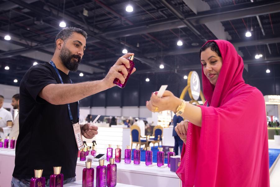 Expositor apresenta perfumes na exposição "Aroma Arábia" em Manama, Bahrein, em 25 de novembro de 2025. (Xinhua/Chen Junqing)