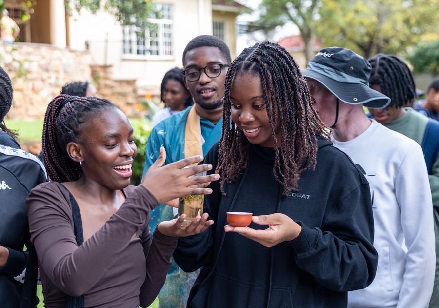 Estudantes provam chá chinês em um evento comemorativo do Dia Internacional da Língua Chinesa no Instituto Confúcio da Universidade de Joanesburgo, em Joanesburgo, África do Sul, em 17 de abril de 2025. (Xinhua/Zhang Yudong)