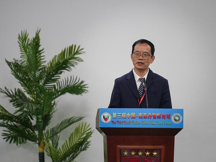 Liu Hongwu, diretor-geral do Instituto de Estudos Africanos da Universidade Normal de Zhejiang, discursa na 3ª edição do Fórum de Think Tanks Sudão do Sul-China em Juba, Sudão do Sul, em 12 de abril de 2024. (Xinhua/Han Xu)