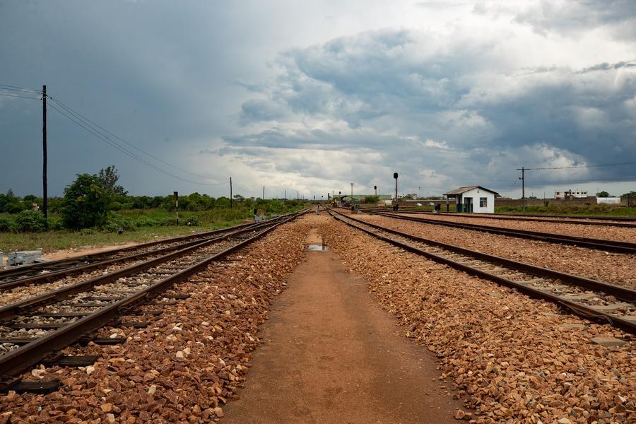 Foto tirada em 14 de novembro de 2025 mostra trilhos da ferrovia na Estação Ferroviária de New Kapiri Mposhi, na Província Central, Zâmbia. (Xinhua/Peng Lijun)