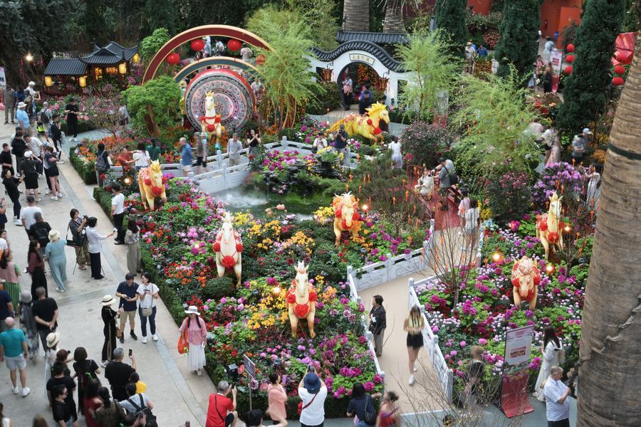 Visitantes aproveitam exposição floral no Domo das Flores dos Jardins da Baía de Cingapura, em 16 de janeiro de 2026. Oito lanternas em forma de cavalo, em tamanho real, foram exibidas para saudar o Ano do Cavalo Chinês. (Foto de Then Chih Wey/Xinhua)