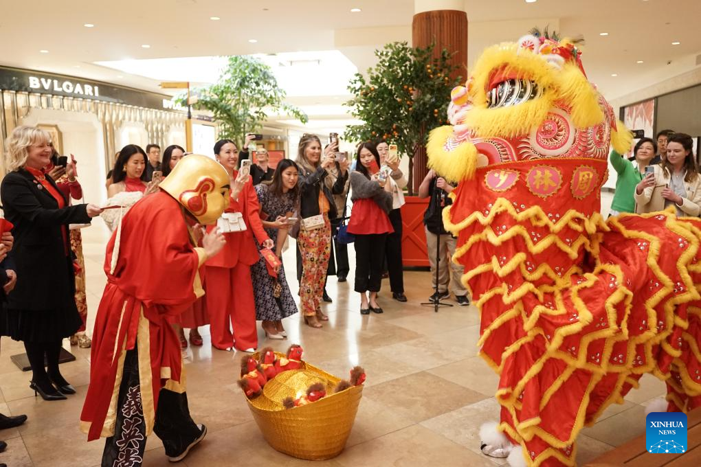 Pessoas assistem a uma apresentação de dança do leão no South Coast Plaza, Condado de Orange, Califórnia, Estados Unidos, em 12 de fevereiro de 2026. (Foto de Zeng Hui/Xinhua)