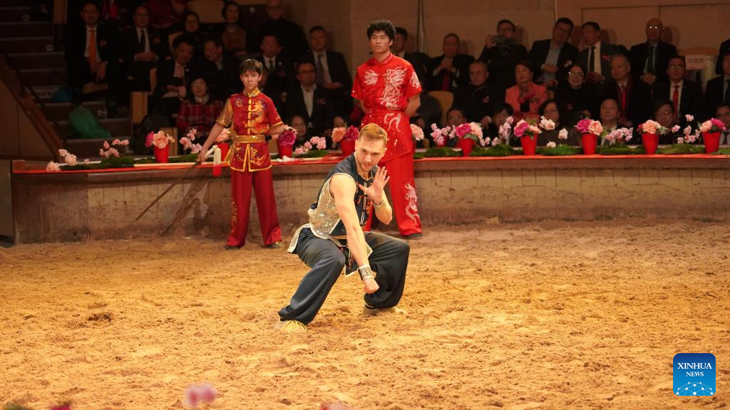 Artista executa artes marciais durante uma gala em comemoração ao Ano do Cavalo no calendário chinês, nas Grandes Cavalariças da propriedade do Castelo de Chantilly, na região de Hauts-de-France, França, em 11 de fevereiro de 2026. Organizado em conjunto pelas autoridades regionais de Hauts-de-France e pela Embaixada da China na França, o evento se diferenciou de muitas outras atividades do Ano Novo Chinês. Nas Grandes Cavalariças, o destaque foi uma forma de arte tipicamente local: uma apresentação equestre tradicional francesa. (Xinhua/Cui Kexin)