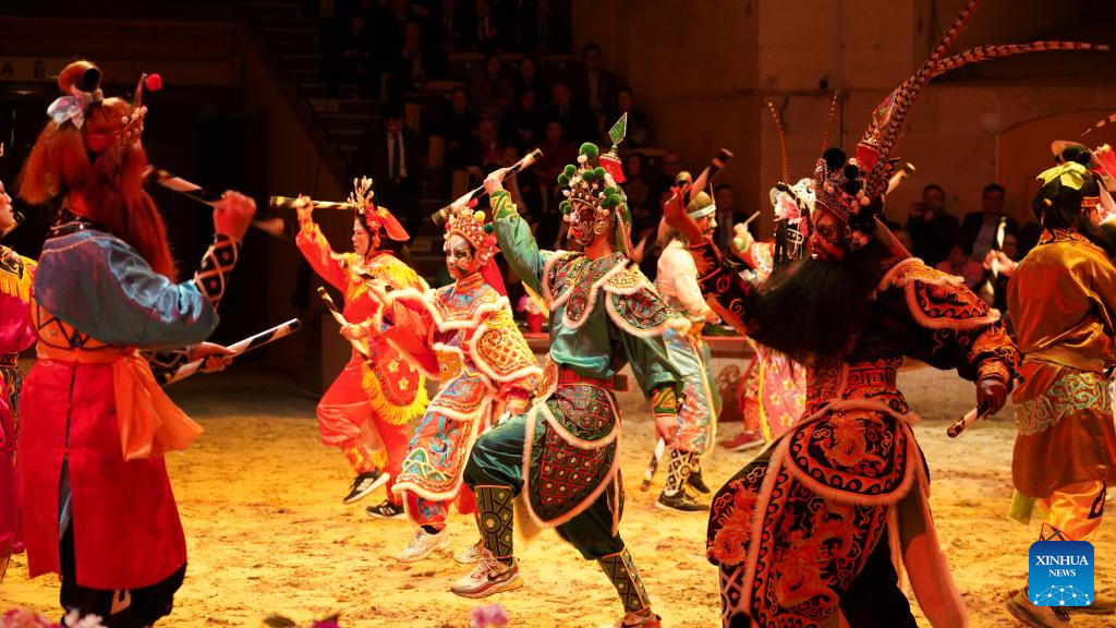 Artistas apresentam dança folclórica Yingge, da província de Guangdong, no sul da China, durante uma gala em comemoração ao Ano do Cavalo no calendário chinês, nas Grandes Cavalariças da propriedade do Castelo de Chantilly, na região de Hauts-de-France, França, em 11 de fevereiro de 2026. Organizado em conjunto pelas autoridades regionais de Hauts-de-France e pela Embaixada da China na França, o evento se diferenciou de muitas outras atividades do Ano Novo Chinês. Nas Grandes Cavalariças, o destaque foi uma forma de arte tipicamente local: uma apresentação equestre tradicional francesa. (Xinhua/Cui Kexin)