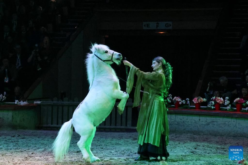 Apresentação equestre tradicional francesa é encenada durante uma gala em comemoração ao Ano do Cavalo no calendário chinês, nas Grandes Cavalariças da propriedade do Castelo de Chantilly, na região de Hauts-de-France, França, em 11 de fevereiro de 2026. Organizado em conjunto pelas autoridades regionais de Hauts-de-France e pela Embaixada da China na França, o evento se diferenciou de muitas outras atividades do Ano Novo Chinês. Nas Grandes Cavalariças, o destaque foi uma forma de arte tipicamente local: uma apresentação equestre tradicional francesa. (Xinhua/Zhang Baihui)