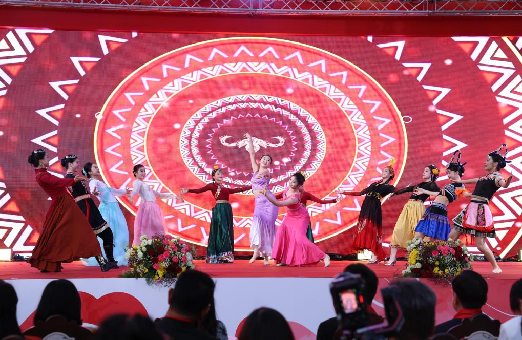 Em Bancoc, a Rua Yaowarat, do Círculo Odeon até o cruzamento de Chaloem Buri, está decorada com uma iluminação festiva em grande escala, com cinco caracteres chineses formando a frase "Zhong Tai Yi Jia Qin" brilhando intensamente na entrada, criando uma atmosfera vibrante que comemora a prosperidade e a longa amizade entre os dois países.