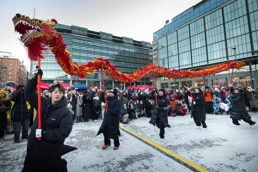 Dança do dragão é apresentada durante a feira folclórica "Feliz Ano Novo Chinês" de 2026 em Helsinque, Finlândia, em 13 de fevereiro de 2026. (Foto de Matti Matikainen/Xinhua)