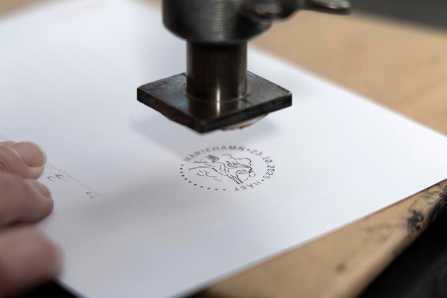 Funcionária usa carimbo postal com o tema do Ano do Cavalo em um cartão-postal na sede dos Correios de Aland, em Mariehamn, capital da região autônoma das Ilhas Aland, na Finlândia, em 21 de janeiro de 2026. (Foto de Matti Matikainen/Xinhua)