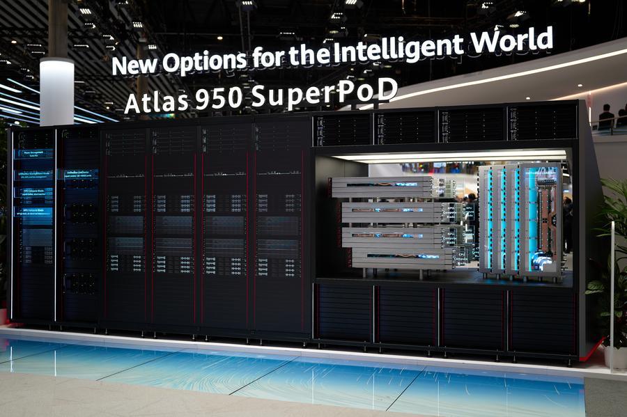 Foto tirada em 2 de março de 2026 mostra Atlas 950 SuperPoD da Huawei no Congresso Mundial de Telefonia Móvel 2026 em Barcelona, Espanha. (Xinhua/Meng Dingbo)
