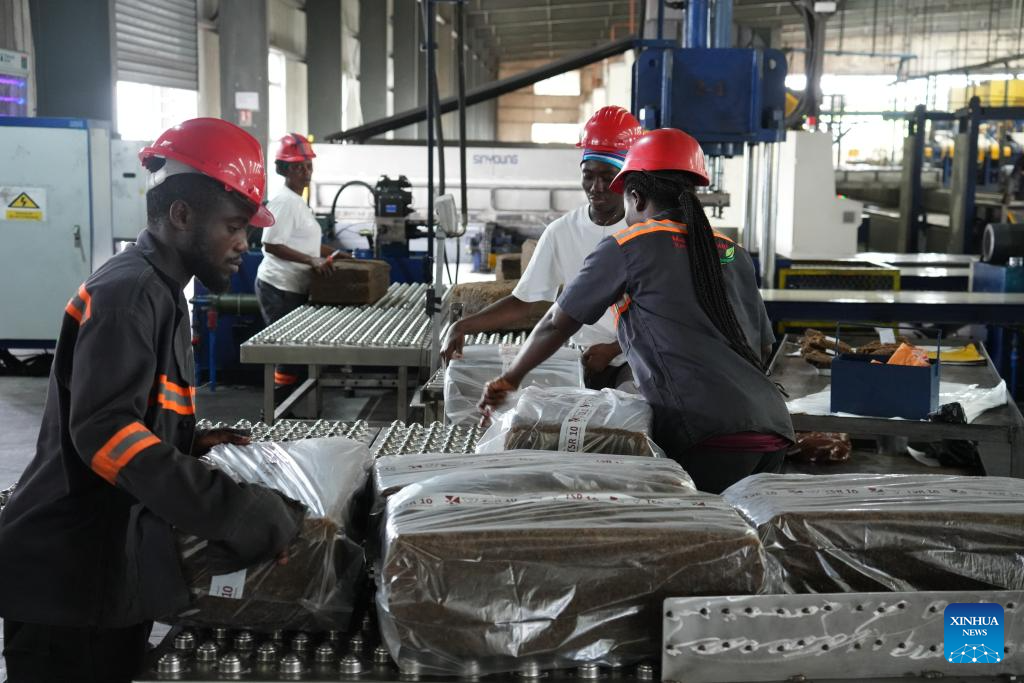Trabalhadores embalam blocos de borracha padronizados em uma fábrica de processamento de borracha do Grupo Mainland da China em San Pedro, Costa do Marfim, em 9 de abril de 2026. (Xinhua/Zhang Jian)