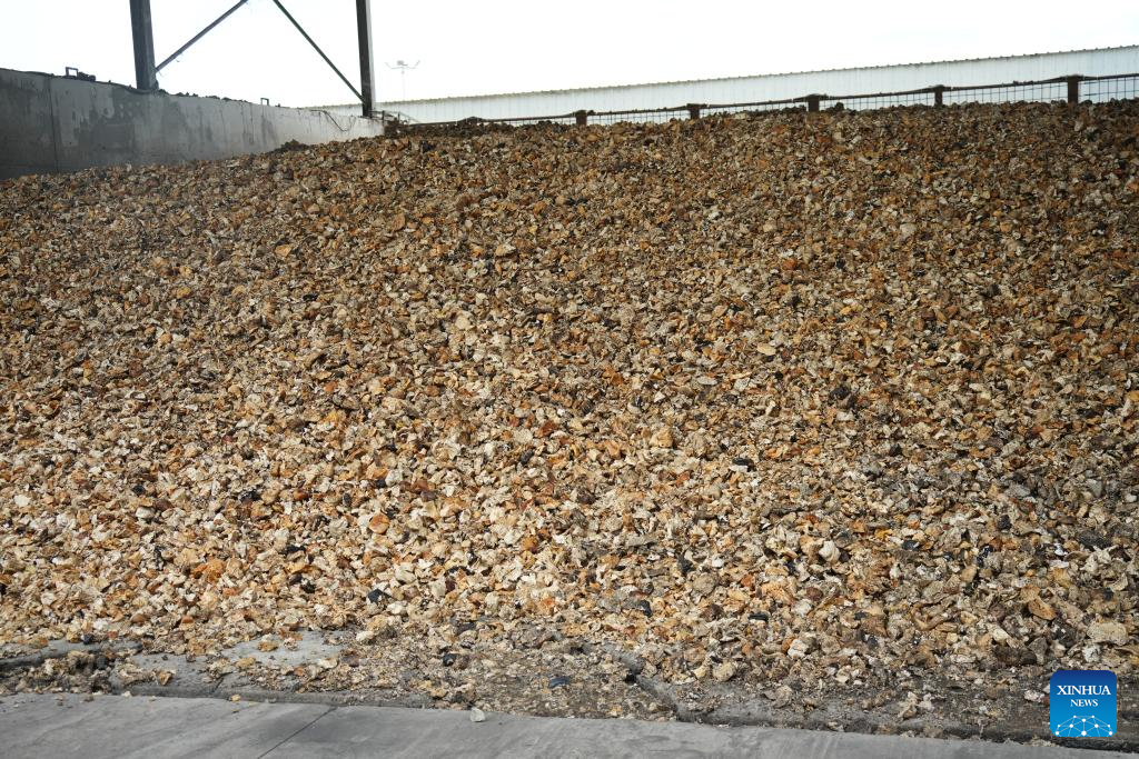 Materiais de borracha pré-processados são transportados por elevador de baldes para a etapa de crepagem e desidratação em uma fábrica de processamento de borracha do Grupo Mainland da China em San Pedro, Costa do Marfim, em 9 de abril de 2026. (Xinhua/Zhang Jian)