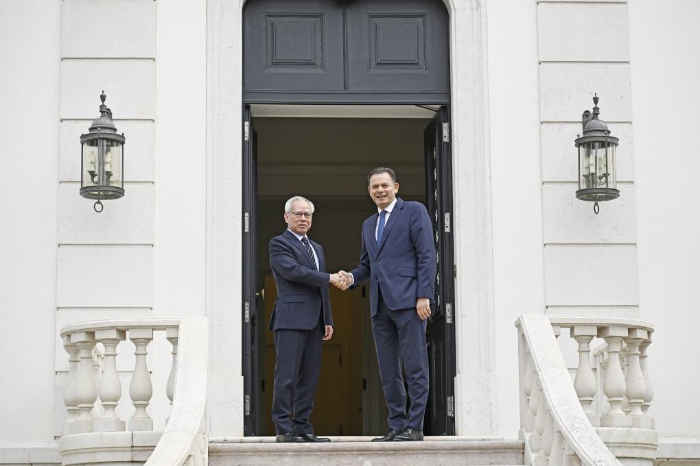 Primeiro-ministro português Luís Montenegro (à direita) reúne-se com o chefe do Executivo da Região Administrativa Especial de Macau (RAEM), Sam Hou Fai, em Lisboa, Portugal, em 21 de abril de 2026. (GCS da RAEM/Divulgação via Xinhua)