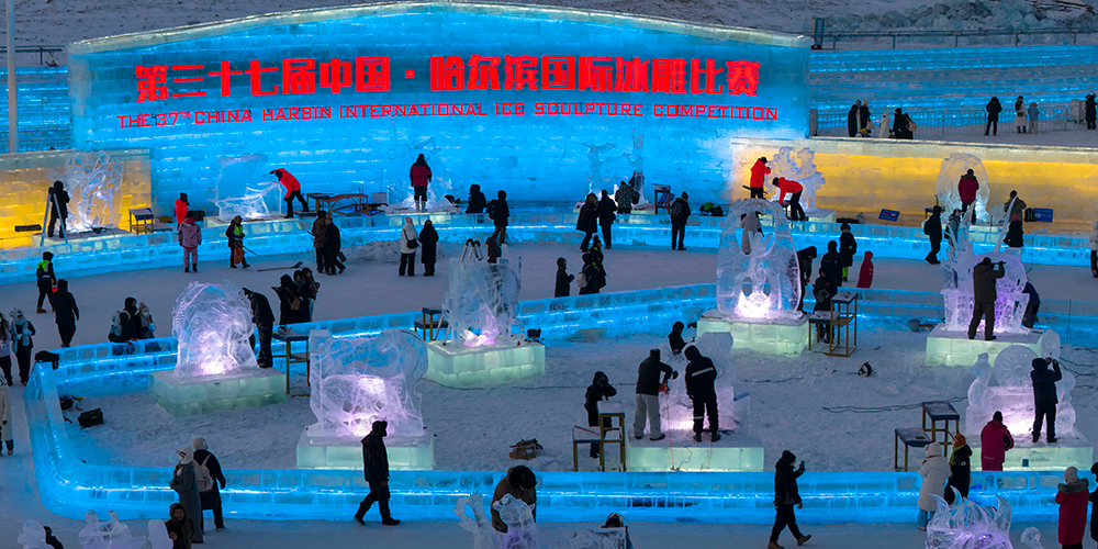 Competidores brilham no 37º Concurso Internacional de Esculturas de Gelo em Harbin
