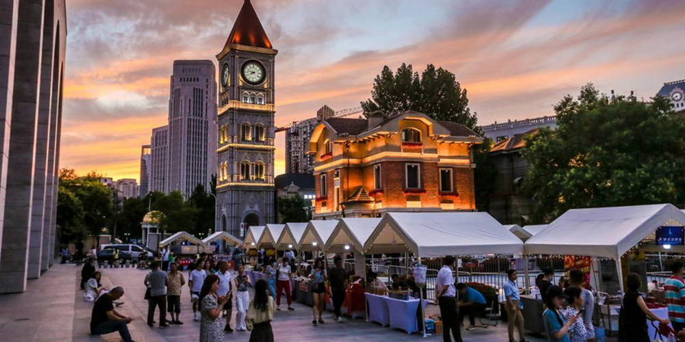 Turistas tiram fotos na praça de arte arquitetônica em Harbin
